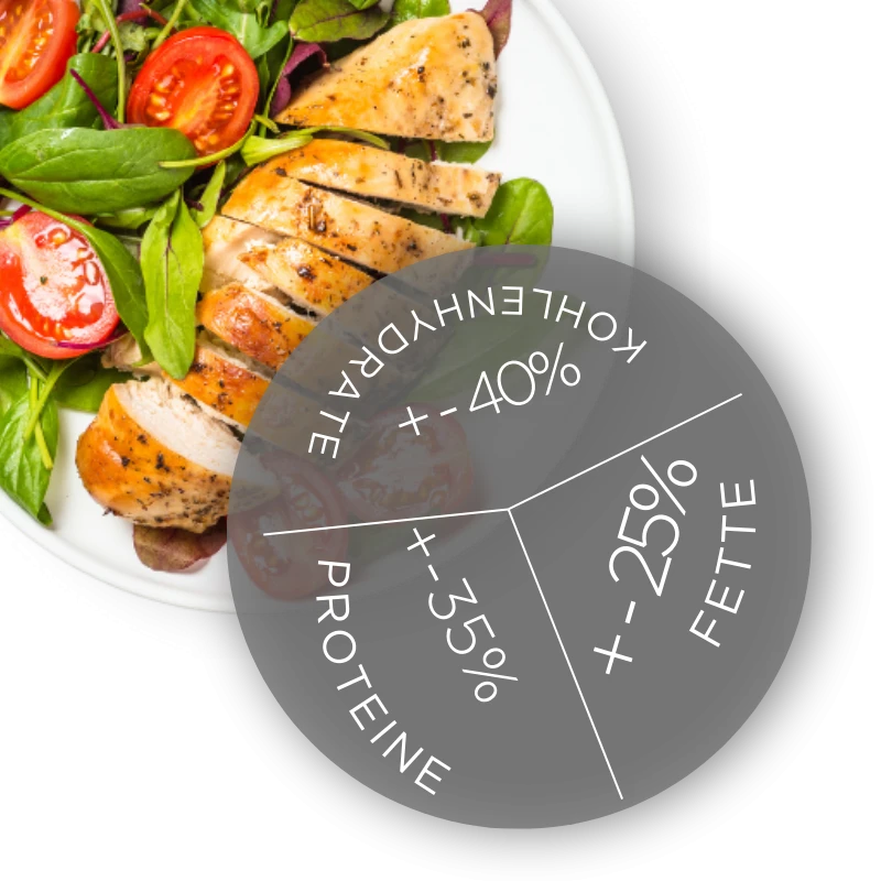 Der Speiseplan wird in Zusammenarbeit mit einem Ernährungsberater zusammengestellt, damit Sie über den Tag verteilt ein optimales Verhältnis von Kohlenhydraten, Fetten und Proteinen zu sich nehmen.