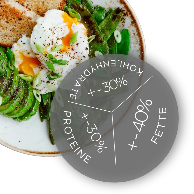 Der Speiseplan wird in Zusammenarbeit mit einem Ernährungsberater zusammengestellt, damit Sie über den Tag verteilt ein optimales Verhältnis von Kohlenhydraten, Fetten und Proteinen zu sich nehmen.
